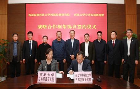 2月29日,我校公共行政研究院与西北农林科技大学西部发展研究院签订战略合作协议。第十一届全国政协副主席、我校原校长陈宗兴,陕西省十届人大常委会副主任、陕西省决策咨询委员会副主任、西北大学公共行政研究院院长邓理,中国生态文明研究与促进会会长助理王春益研究员,省政协副秘书长马鹏程,杨凌示范区管委会副主任刘天雄,西北农林科技大学党委书记李兴旺、校长孙其信、副校长钱永华,我校校长郭立宏以及校办、社科处、国内合作与校友工作处、公共管理学院负责人、专家学者参加签约仪式。签约仪式由李兴旺主持。