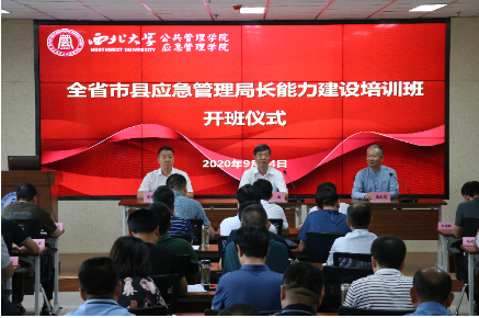 2020年9月14日上午,我院与陕西省应急管理厅举办的“全省市县应急管理局长能力建设培训班”在我院多媒体会议室举行开班仪式。陕西省应急管理厅党委委员、副厅长李进同志,西北大学党委常委、副校长王正斌教授,我院院长雷晓康教授出席开班仪式。来自全省市县七十余名应急管理局长参加了开班仪式。