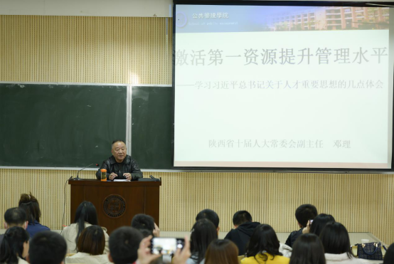 2020年11月6日下午在西北大学太白校区7111教室,西北大学公共管理学院邀请到了陕西省人大十届常委会副主任、省决策咨询委员会副主任邓理同志,他为我院MPA师生带来题为“激活第一资源、提升管理水平——学习习近平总书记关于人才重要思想的几点体会”的专题讲座。本次讲座是公共管理学院20周年院庆系列活动之一,也是西北大学MPA名家论坛系列之一。讲座由雷晓康院长主持,王尧宇副校长致辞,公共管理学院部分教师和2020级全体MPA学生参加。