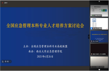 为充分发挥全国应急管理本科院校联盟平台作用,完善应急管理本科人才培养方案,提高应急管理人才培养质量,2021年6月26日,西北大学应急管理学院通过线上方式,召开全国应急管理本科专业人才培养方案研讨会。参加研讨会的成员单位有中国人民大学、南京师范大学、河海大学、石河子大学、河南理工大学、沈阳化工大学等23所院校。此外,高等教育出版社和应急管理出版社也应邀参加了本次研讨会。研讨会由西北大学应急管理学院院长雷晓康教授主持。