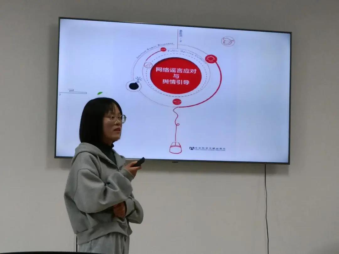 朱娜娜同学则分享了姜胜洪老师的著作《网络谣言应对与舆情引导》一书。起初先是介绍了本书作者姜胜洪老师,紧接着分析了本书写作的背景及所引发了怎样的社会问题,引发了学者及社会各界的广泛关注。随着我国互联网的使用率不断提升,网民规模日益壮大,对于互联网的监管显得愈发力不从心,网络谣言乘虚而入,给社会治理带来难题。朱娜娜同学首先给出了明确的态度,网络谣言是不容忽视的负面舆情,随后对于网络谣言的产生原因,发展规律,及传播模式进行分析,并进一步介绍了网络谣言蔓延带来的诸多危害,以及引发的群体性事件。最后介绍了我国治理网络谣言存在的问题并通过借鉴国外网络谣言治理的成功经验,提出我国应对网络谣言的治理对策。