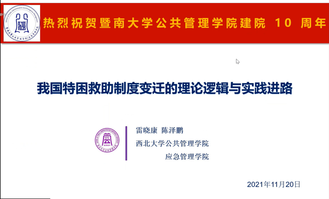 雷院长首先对暨南大学公共管理学院建院10周年表示祝贺,接着以《我国特困救助制度变迁的理论逻辑与实践进路》为主题进行了分享。雷院长从问题缘起:特困救助的制度变迁、道德基因:集体怜悯式互助供养的发生逻辑、社会契约:国家强制式托底供养的发生逻辑、共同富裕:新发展阶段特困救助的前瞻构想、结语五部分对我国特困救助制度变迁的理论基础、政策选择以及执行成效进行了全面回顾,并结合团队的调研经历,构想了我国扎实促进共同富裕阶段特困救助工作的优化向度。