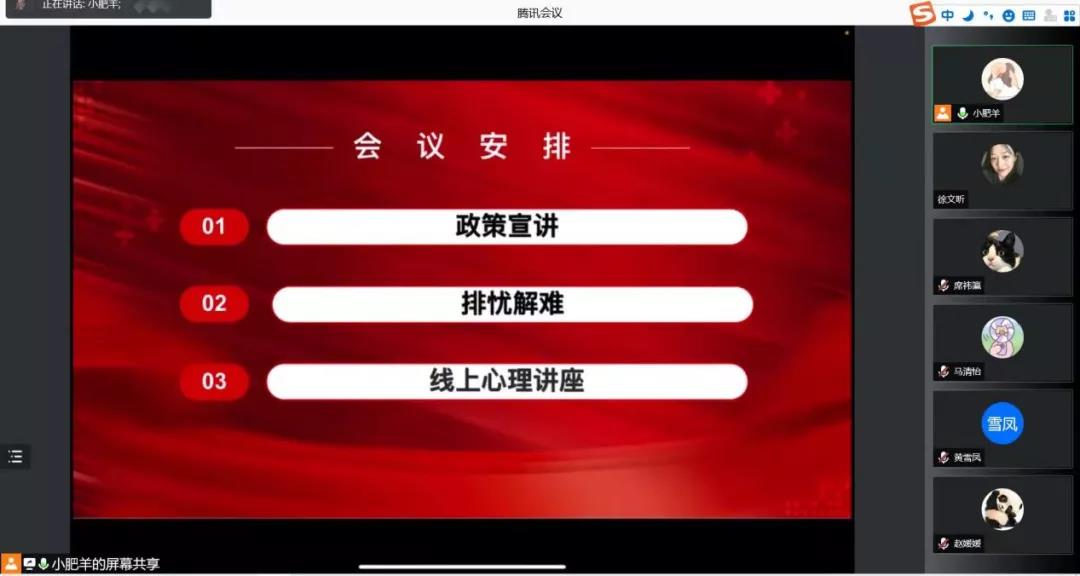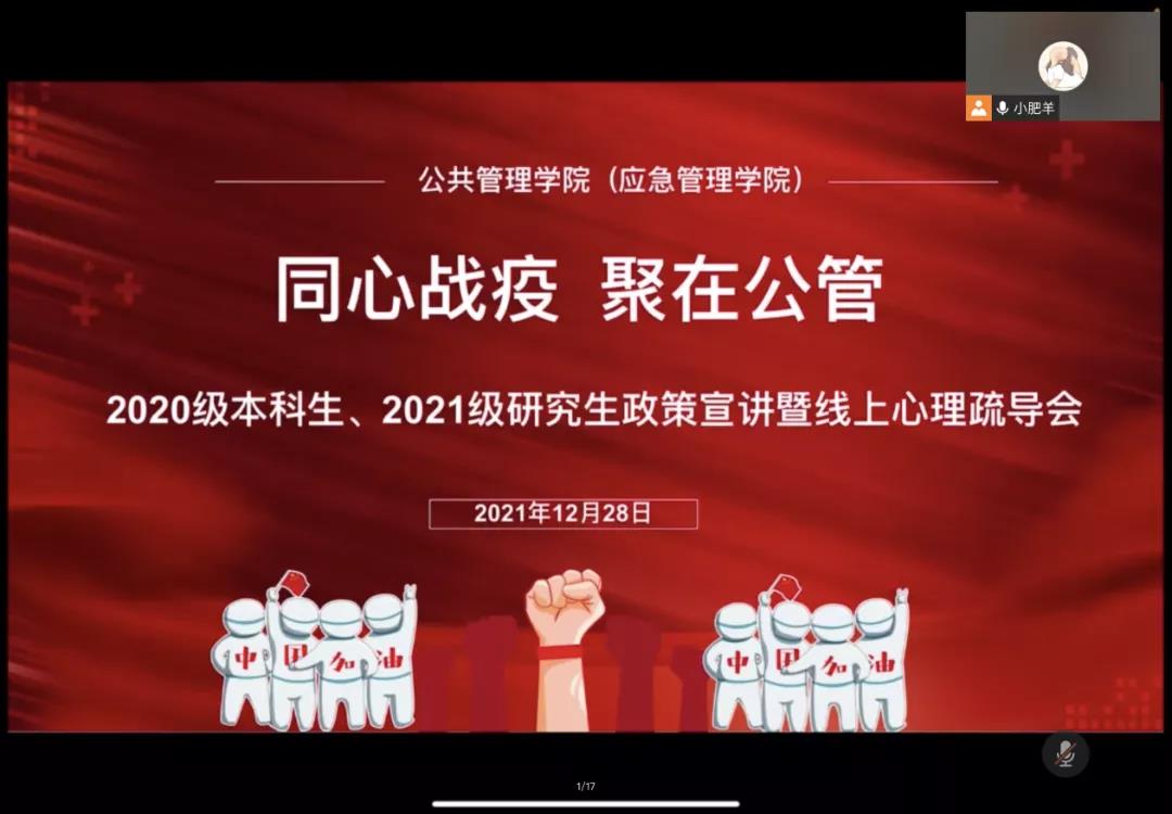 为传达疫情防控政策,疏导同学情绪,2021年12月28日,公共管理学院2020级本科生、2021级研究生在辅导员杨嘉仪老师的组织下召开了《同心战役,聚在公管》政策宣讲暨线上心理疏导会。