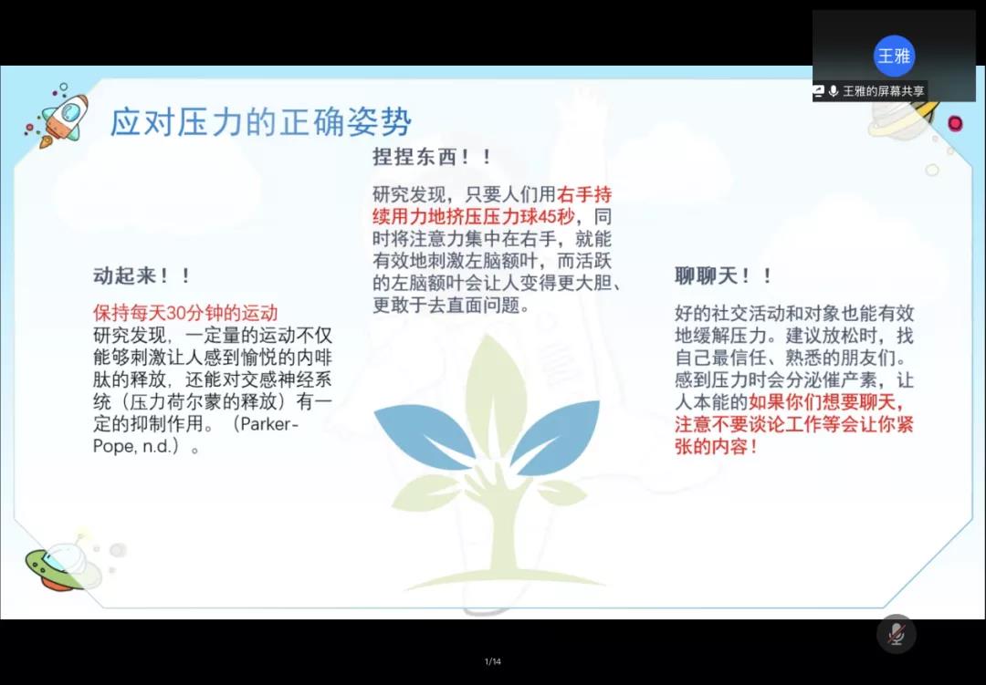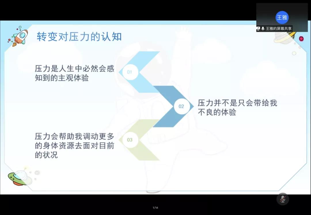 在会议最后,杨嘉仪老师邀请到了2021级应用心理学研究生王雅同学为我们带来《与压力和解——面对压力的正确姿势》线上心理讲座,帮助大家在疫情封控期间充实相关知识,保持良好心态,正确面对压力并积极解决压力。