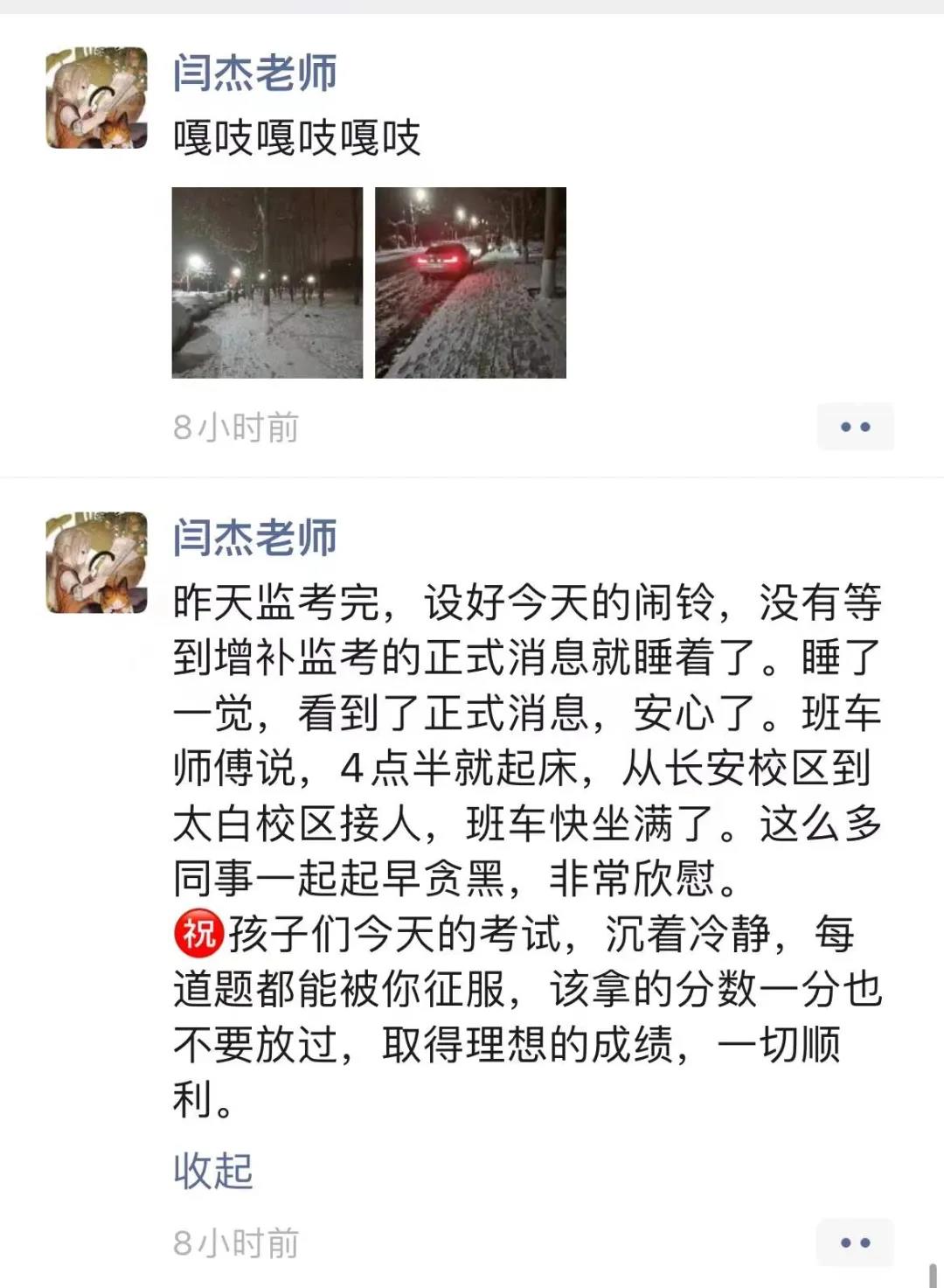 (冒着风雪赶往考场的监考老师们)