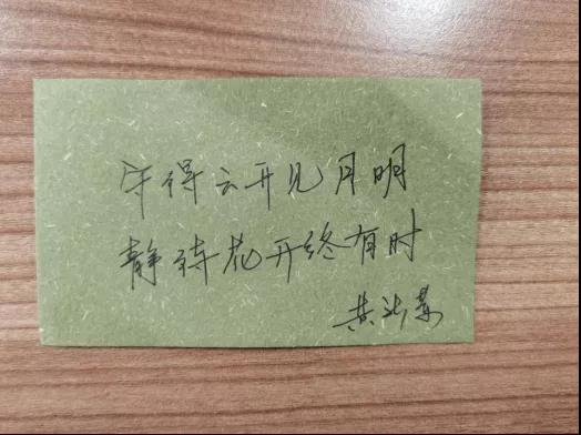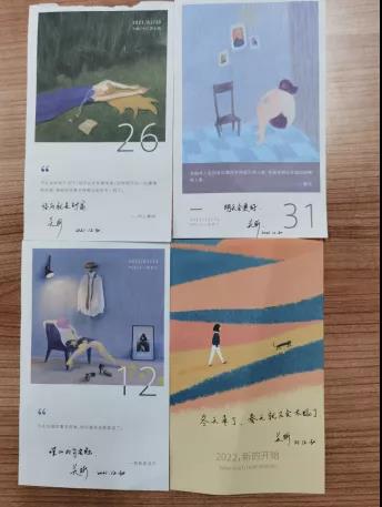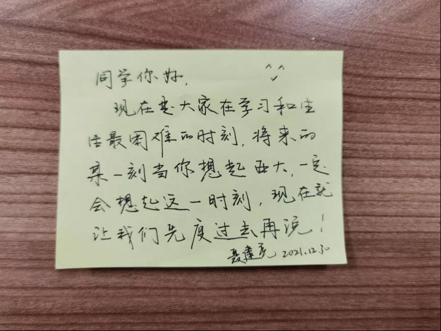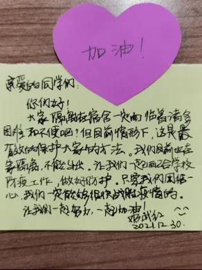 疫情下,同学们无法与家人团聚,这个时刻,公管院的老师们担任起了第二父母的角色。心理疏导、督促打卡、线上教育、采购生活用品,从生活到学习,无微不至地照顾起同学们。正如卡片上所说:“好好吃饭,安心学习,加强锻炼。”简单的话语蕴含着教师们对学生们的关心。