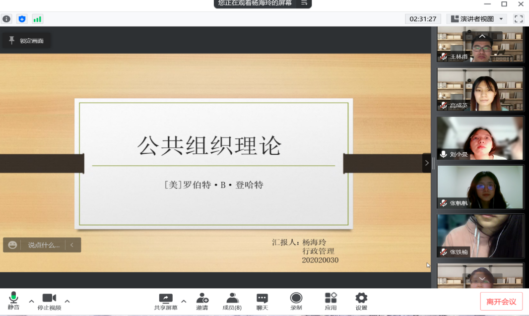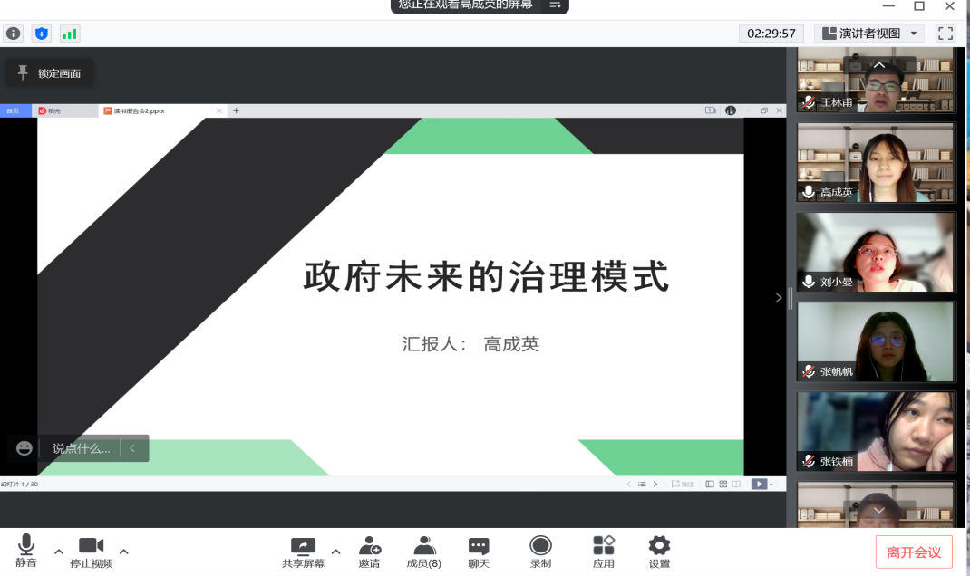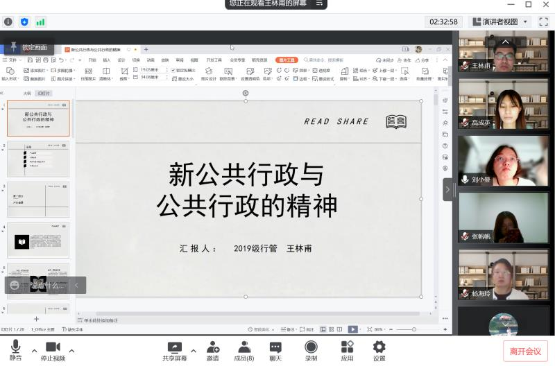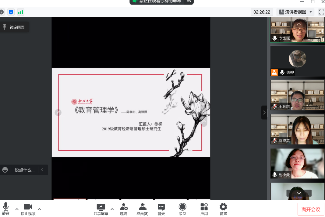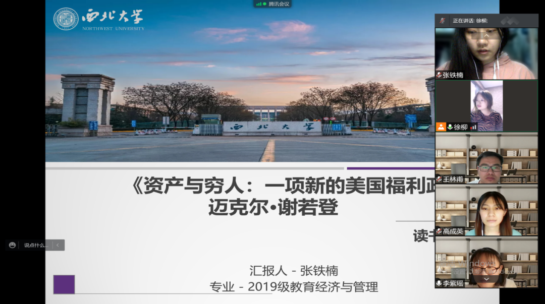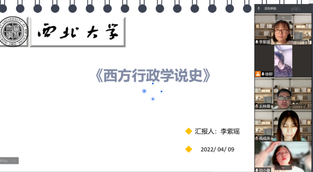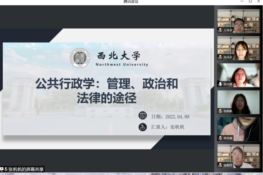 2022年4月9日19:00,西北大学公共管理学院线上举行了2022年第5期“正学读书会”活动。西北大学公共管理学院2019级教育经济与管理硕士研究生徐柳、张铁楠,2019级行政管理专业研究生高成英、王林甫,2020级行政管理硕士研究生李紫瑶、杨海玲、张帆帆分别分享了自己的读书心得,公共管理学院2020级博士研究生刘小曼担任评议人。