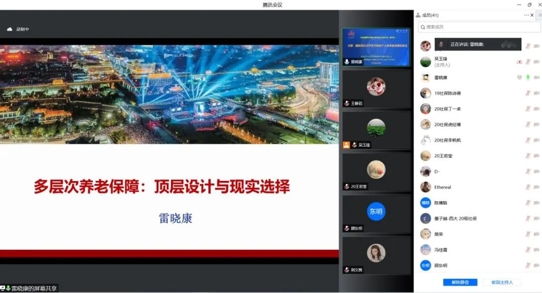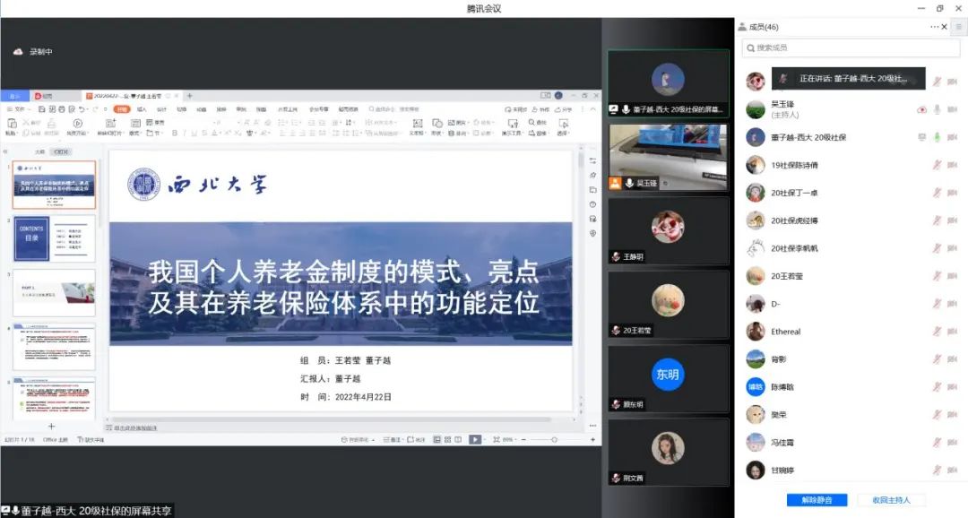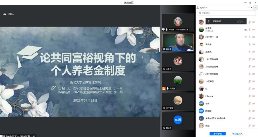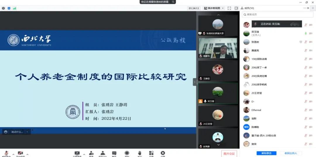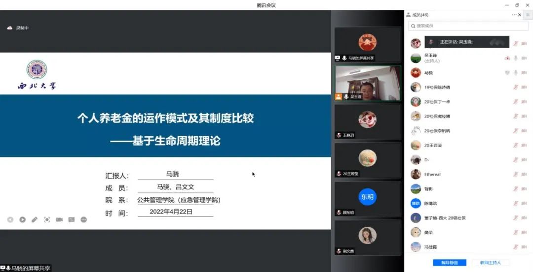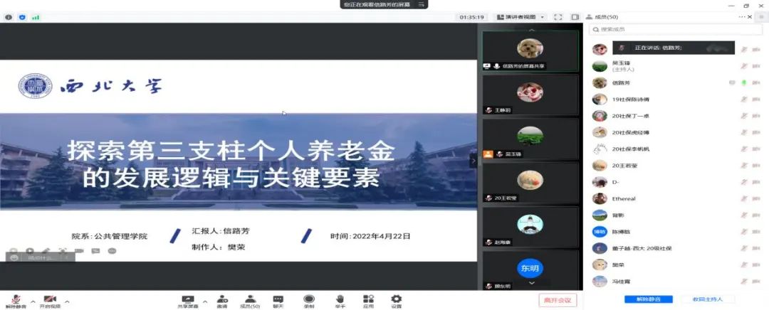 2022年4月21日,国务院办公厅印发《关于推动个人养老金发展的意见》,这是贯彻落实党中央、国务院构建多层次、多支柱养老保险体系和规范发展第三支柱养老保险要求的具体举措。为了深入学习解读国务院办公厅《关于推动个人养老金发展的意见》,2022年4月22日,西北大学公共管理学院(应急管理学院)社会保障学系联合民政部政策理论研究基地合作单位(西北大学)举办了线上学习研讨会,我院社会保障学系师生50余人参加了学习研讨。本次学习研讨会由社会保障学系系主任吴玉锋副教授主持,雷晓康教授做了《多层次养老保障:顶层设计与现实选择》的专题报告,周明教授和聂建亮副教授对硕士研究生的汇报进行了评议,唐丽娜副教授、厉旦老师和祝毅老师参与了线上会议。