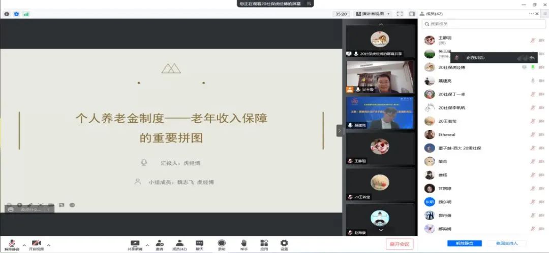 最后,吴玉锋副教授对整场学习研讨会总结发言,他表示此次学习研讨会增强了同学们对养老金制度的进一步认识与了解,目前我国老龄化发展速度之快,仅靠基本的养老保险是完全不够的,而第三支柱个人养老金制度能在一定程度上缓解整体的养老压力,是社会保障专业同学应该掌握的重点研究方向。最后会议在一片掌声中圆满结束。