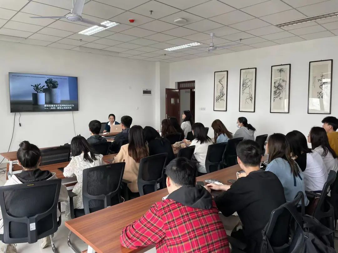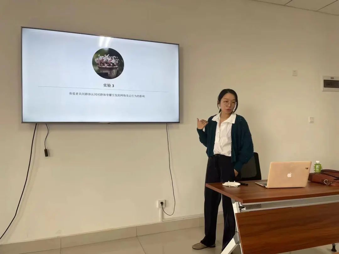 在讨论阶段,刘鹏老师建议可以将研究的创新点聚焦于个体网络攻击行为中群体变量的影响上,突破已有研究仅考虑个体变量的局限,提升研究的创新性;李贺老师与高阳老师讨论了网络情境中攻击行为的特异性问题,并一致认为,在网络情境中研究群体夸耀对个体攻击行为的影响是本研究的创新点之一;2019级心理学硕士生王东阳提问个体变量和群体变量是否要用跨层次研究,以及因果效应可能不唯一,是否存在直接路径成立的边界条件?2020级心理学硕士生王珂懿提出在隐性自夸的条件中,旁观者是否会不自觉的与炫耀者进行社会比较,当发现对方在某个方面比自己优秀时,便会产生威胁感,从而认为自己被挑衅,导致一定程度的攻击行为。同时,这种影响方式或许会被旁观者的自我概念(即自尊和自信两方面)所调节。高阳老师对上述同学的提问进行了耐心的回答。
