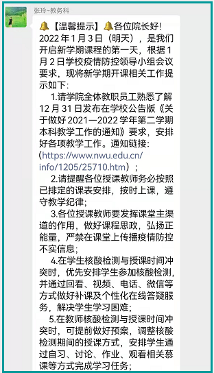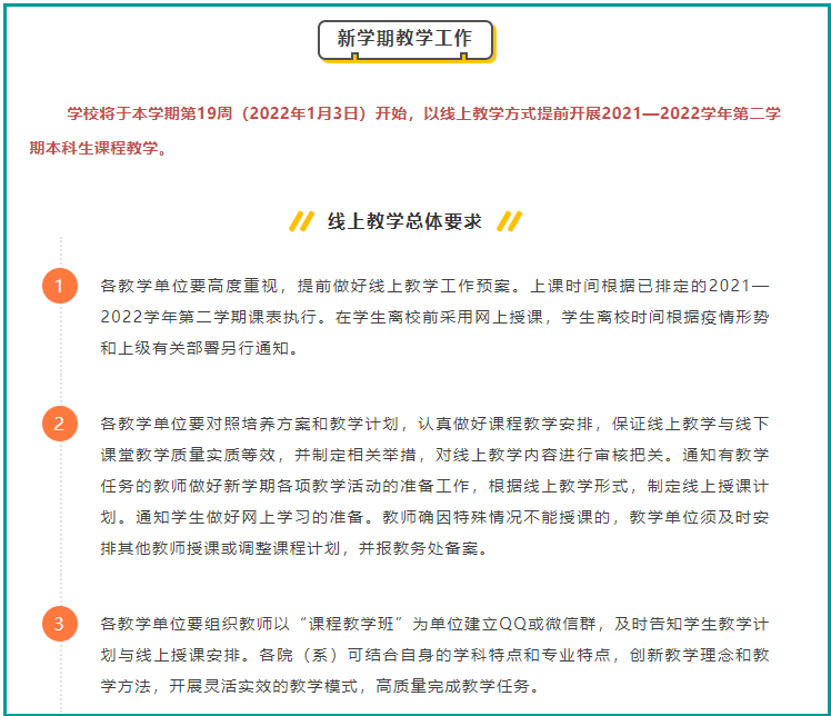 为配合疫情防控的要求,学校调整教学计划,自2022年1月3日起启动2021-2022学年第二学期的教学任务,原定2022年2月的第二学期“新”然而来。为保证线上教学工作的顺利开展和实质等效,学校教务处无微不至,从温馨提醒到资源联络,从信息收集发布到线上质量保障体系建设,都做了非常全面系统的部署。