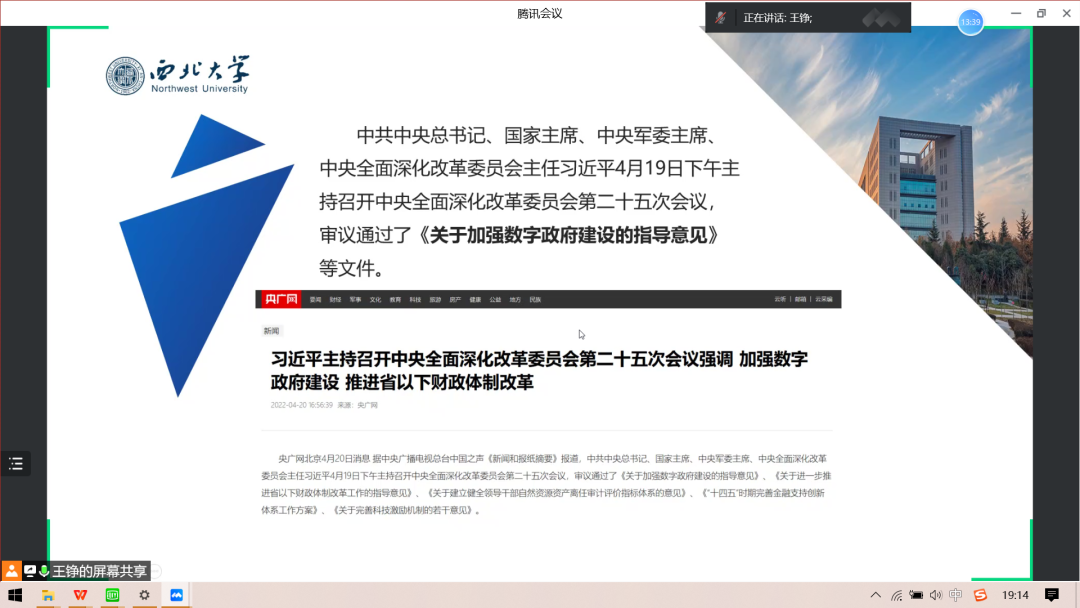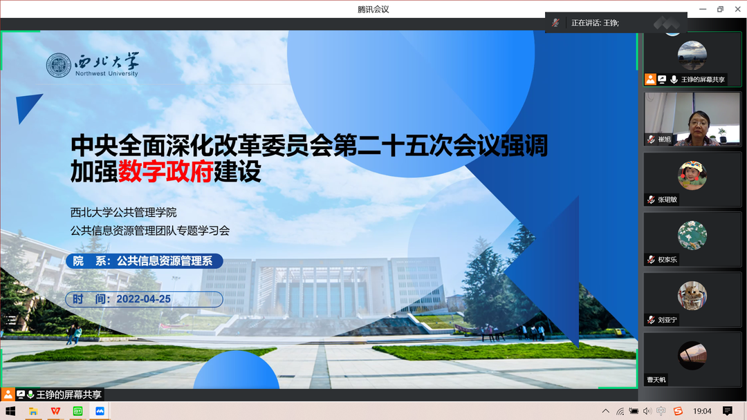 2022以来,数字中国战略加速推进,相关政策密集发布。尤其是2022年4月中旬一周之内,《关于加强数字政府建设的指导意见》《2022年数字乡村发展工作要点》等文件相继发布,凸显了党和政府对于数字政府、数字乡村、数字经济、数字社会等领域的高度重视。在此背景下,西北大学公共管理学院(应急管理学院)公共信息资源管理系于2022年4月25日晚在线举办了主题为《全面深化改革背景下的“数字政府”建设》的专题学习会。本次研讨会由王铮副教授主持,崔旭教授评议。我院公共信息资源管理系系师生包括即将于9月入学的2022级硕士新生参与了学习研讨。