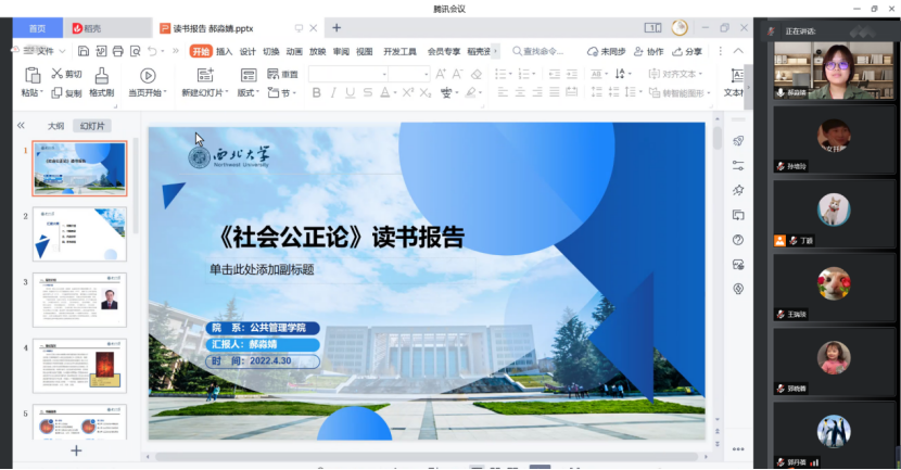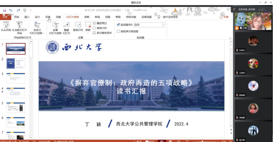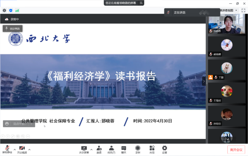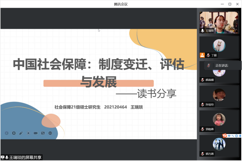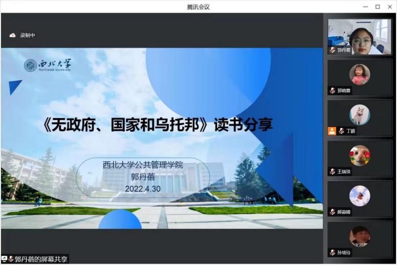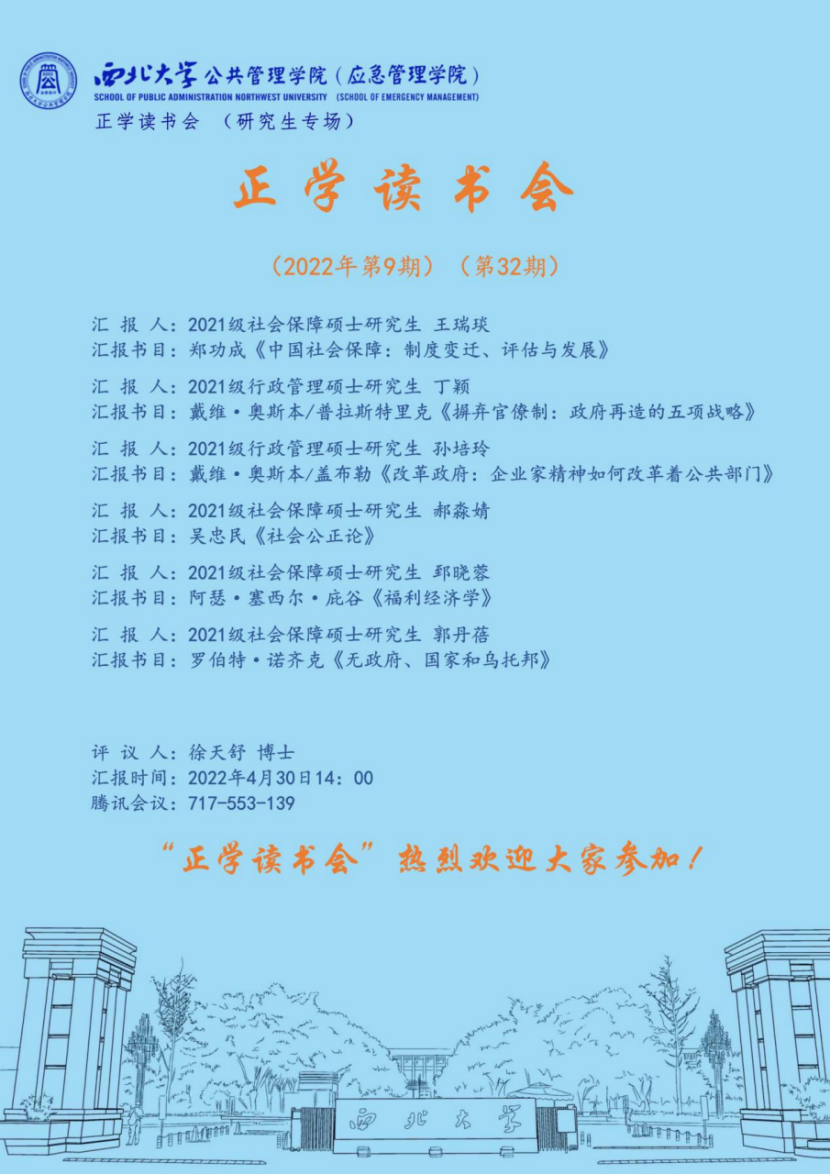 2022年4月30日下午14:00,西北大学公共管理学院正学读书会2022年第9期在线上举行。西北大学公共管理学院2021级行政管理专业硕士研究生丁颖、孙培玲和2021级社会保障专业硕士研究生王瑞琰、郝淼婧、郅晓蓉、郭丹蓓进行了分享,公共管理学院博士研究生徐天舒担任评议人。