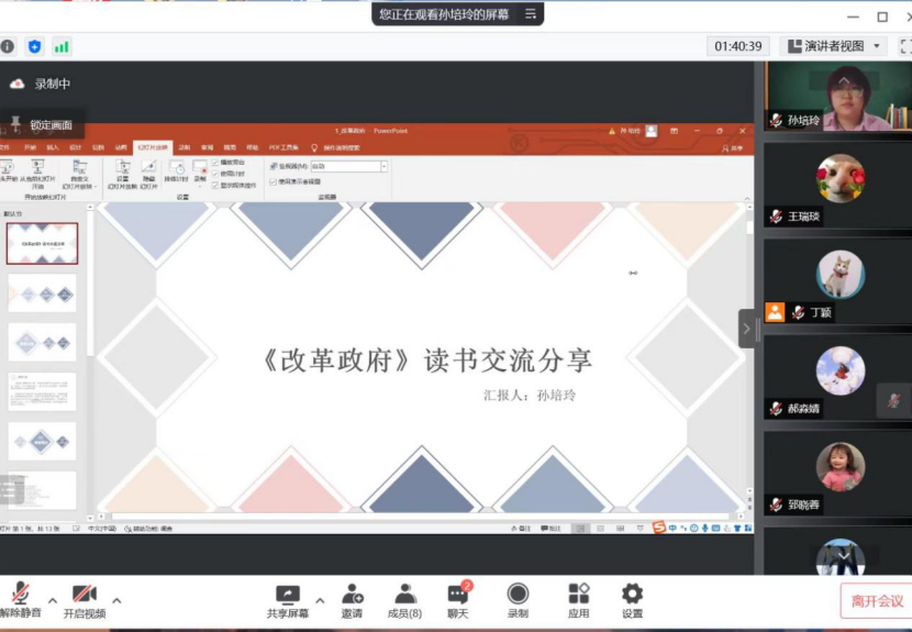 紧接着,2021级行政管理专业硕士研究生丁颖向与会人员分享了《摒弃官僚制:政府再造的五项战略》这本书,汇报从背景介绍、作者简介、主要观点、案例应用四个方面展开,以美国国家森林服务局试点改革为例,着重分享了本书五大战略中的控制战略,对控制战略中社区授权进行了详细讲解,并结合2022年年初西安疫情中社区治理的现状,进行了总结和反思,从社区授权的角度提出了提升社区治理效能的建议。