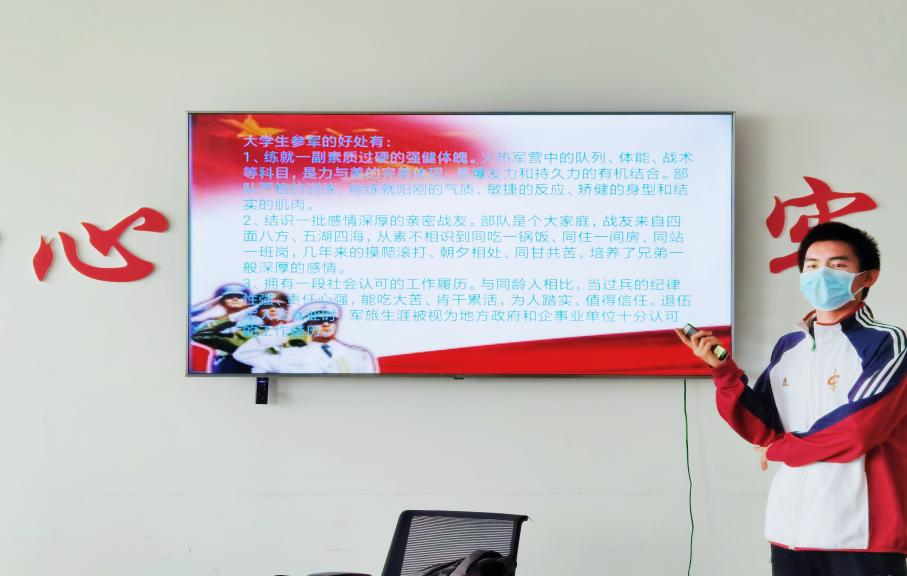 会上,郝开先同学首先根据征兵宣传手册,结合学校所属辖区的征兵政策,借助图片形式生动详细地介绍了应征入伍的基本条件和参军入伍的流程,从时间、条件、流程等三方面进行解释说明,助同学们了解征兵相关政策;同时结合前途、阅历、荣誉等多个角度为大家讲解大学生入伍的有利条件和优惠待遇,以众多大学生优秀士兵榜样为例,阐述了大学生入伍对自身成长成才的重要意义,鼓励大家积极应征入伍,为祖国贡献青春力量。