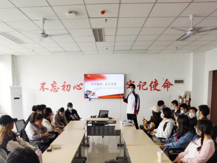在同学踊跃发言和集体观看相关视频后,为进一步调动同学们应征入伍的积极性,王羽涵同学详细传达了学校关于征兵宣传的相关文件要求,对本次征兵工作就报名时间、政策支持、优惠奖励、注意事项等多方面进行了说明,使同学们对于国防知识与国家征兵入伍政策有了充分的了解与认识.