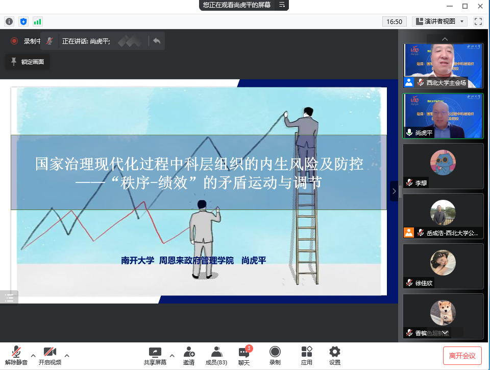 2022年5月7日晚,由西北大学社科处、公共管理学院(应急管理学院)联合主办的名家讲坛在我院成功举办。南开大学周恩来政府管理学院、中国政府发展联合研究中心教授、博士生导师,新疆大学“天山学者”讲座教授尚虎平教授,作了题为“国家治理现代化过程中科层组织的内生风险及防控——“秩序-绩效”的矛盾运动与调节”的学术报告,公共管理学院(应急管理学院)院长雷晓康教授主持了本次讲座,来自全国多所高校的160多名师生在线听取了报告。