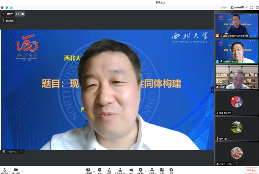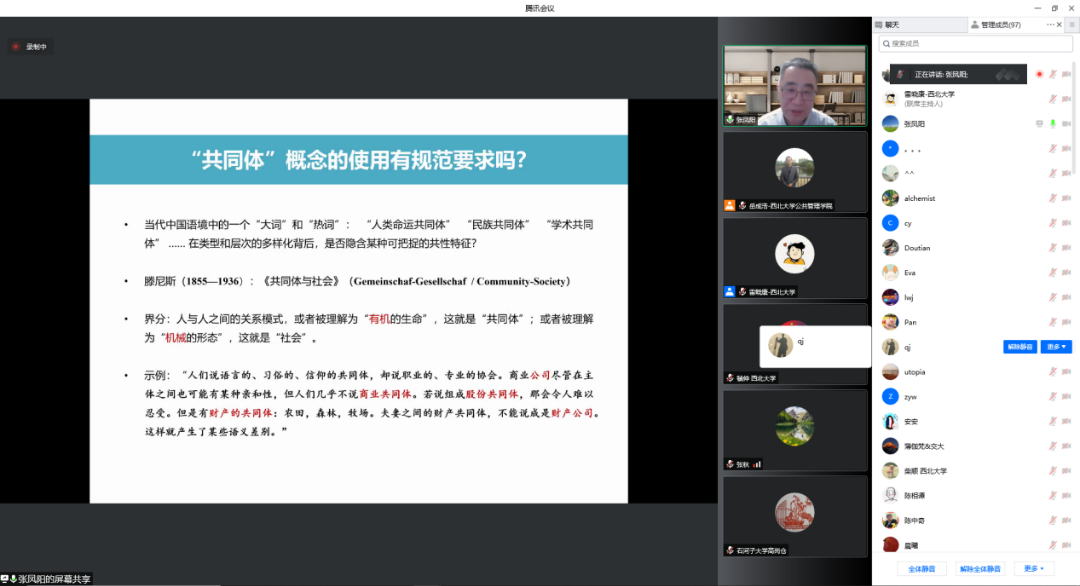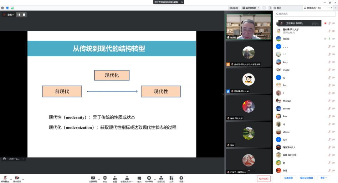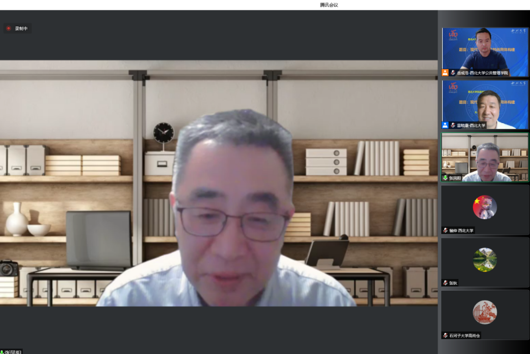 2022年5月20日晚,由西北大学社科处、公共管理学院联合主办的名家讲坛在线成功举办。教育部特聘教授、南京大学政府管理学院张凤阳教授受邀作了题为“现代性视角下的共同体构建”的学术报告。公共管理学院(应急管理学院)院长雷晓康教授主持讲座,来自北京大学、厦门大学、西安交通大学、吉林大学、西北大学等多所高校的160多名师生参与了此次讲座。