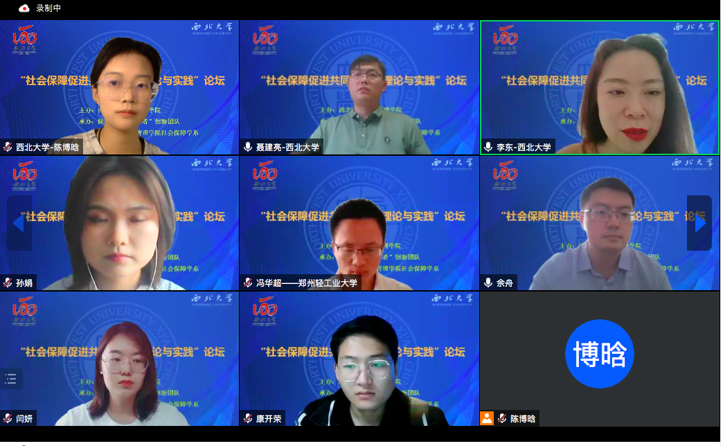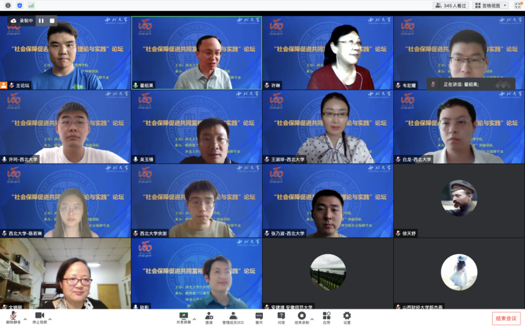 2022年5月21日下午,由西北大学公共管理学院主办、陕西省“三秦学者”创新团队和西北大学公共管理学院社会保障学系承办的“社会保障促进共同富裕:理论与实践”论坛在线上举办。来自中国人民大学、华中科技大学、四川大学、厦门大学、西安交通大学、中国农业大学、新疆大学、内蒙古大学、西北大学等30余所高校、科研院所以及期刊社的200余名学者及博硕士研究生参加了本次会议。