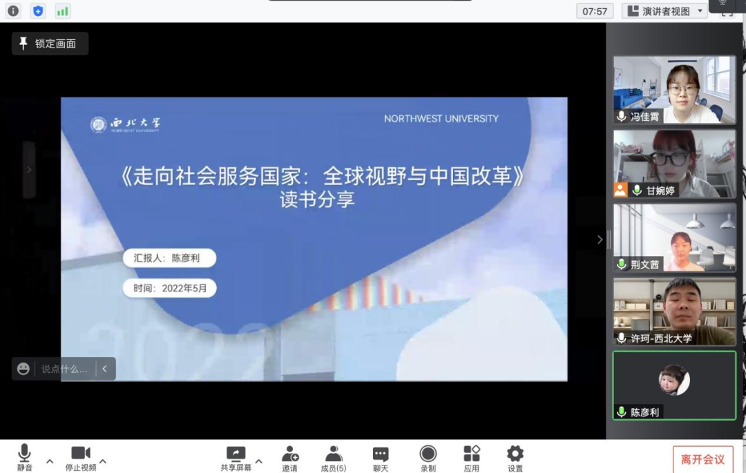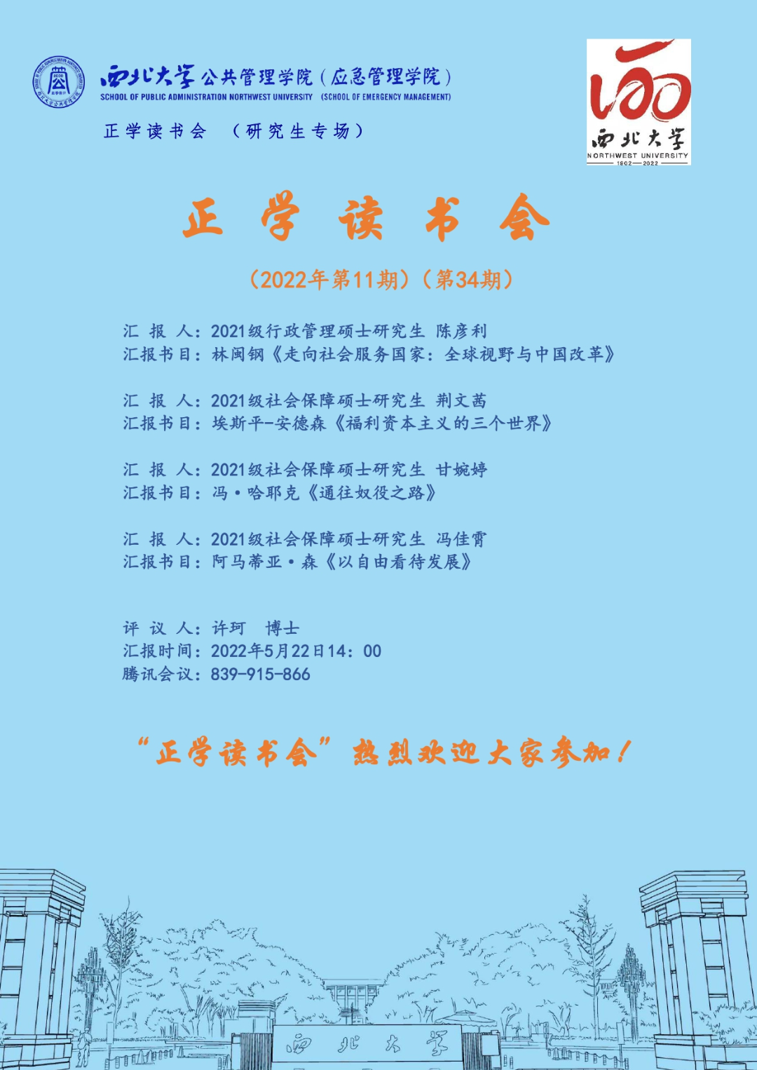 2022年5月22日,我院举办了本学期第11期研究生读书分享会。2021级行政管理专业陈彦利、2021级社会保障专业研究生荆文茜、甘婉婷、冯佳霄进行了汇报,许珂博士作为评议人。