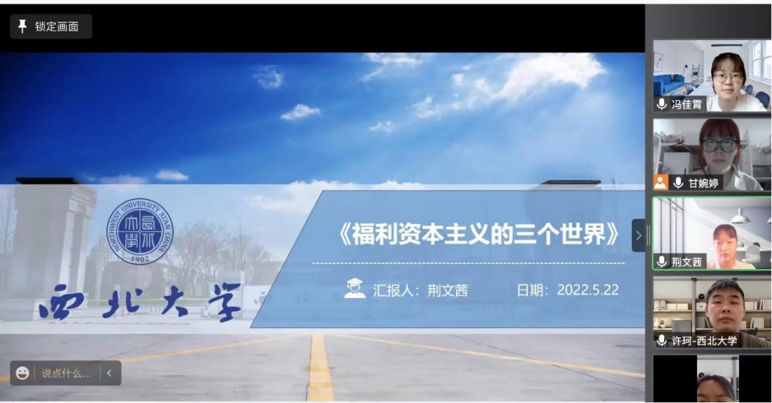 2021级社会保障专业研究生荆文茜分享的书目是埃斯平-安德森的《福利资本主义的三个世界》,主要从作者简介、著作内容、著作思想和总结思考四个部分展开。首先,从历史的发展角度详细介绍了资本主义世界福利政策的衍生和发展,欧洲等西方国家的生产关系改革,其次以非商品化这个工具作为福利国家的参考系将福利国家分为三种模式:盎格鲁——撒克逊国家的自由主义模式、欧洲大陆的社会合作一保守主义模式、斯勘的纳维亚国家的社会民主主义模式,并对三种模式的特征方面进行详细讲解。最后结合我国目前的社会保障进行了总结和反思,福利国家诞生的研究对我国目前社会保障体系的建设也有非常重要的价值。