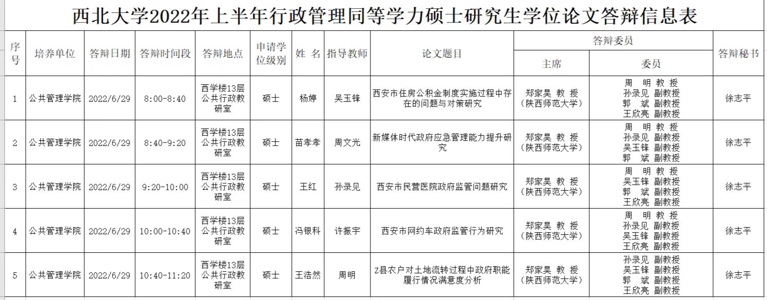 西北大学2022年上半年行政管理同等学力硕士研究生学位论文答辩信息表