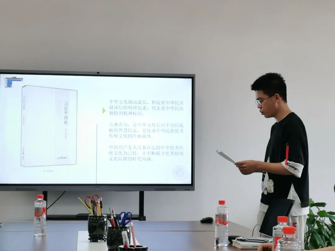 本科生公共行政学系党支部党员刘明雄同志分享的书籍为《习近平用典》。首先他介绍了《习近平用典》的出版背景,习近平总书记多次在讲话中引经据典,展现出独特的语言风格和人格魅力。接着,他从个人篇与国家社会篇两个部分出发,以“敬民”“立德”“廉政”“创新”四个主题词来解读习近平总书记曾经在不同会议上引用过的经典名句。刘明雄同志还通过引用习近平总书记接受金砖五国媒体联合采访时的回答,与大家共同领略我国优秀传统文化的博大内涵和大国智慧。最后,刘明雄同志表示,中华文化源远流长,积淀着中华民族最深层的精神追求,代表着中华民族独特的精神标识,希望大家能够传承发扬中华民族优秀传统文化,坚定文化自信。