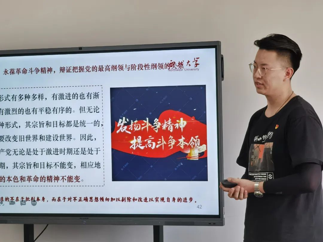 研究生联合党支部书记刘泓贤同志分享了《共产党宣言》一书。首先他深入剖析《共产党宣言》诞生的客观与主观条件,为大家廓清《共产党宣言》诞生的时代图景。接着,他深入分析了《共产党宣言》中能使世界为之改变的理论关切:破解社会现象之谜、明确推动社会发展的直接动力、预测人类社会未来发展方向、区别社会主义社会、共产主义社会同此前一切剥削阶级社会的本质特征、阐述共产主义社会图景以及无产阶级政党的性质。同时,他从理论和实践两个维度破解对《共产党宣言》的三大疑惑,进一步坚定共产主义信念。最后,在学思践悟部分,他结合开展党建工作以及自身学习工作经历,指出要从三方面坚定不移弘扬《共产党宣言》精神:一是弘扬人文主义精神,为全人类的解放而不懈奋斗;二是避免经验主义和教条主义两个极端,探索一条知行合一的真道路;三是永葆革命斗争精神,辩证把握党的最高纲领与阶段性纲领的关系。