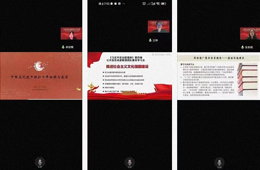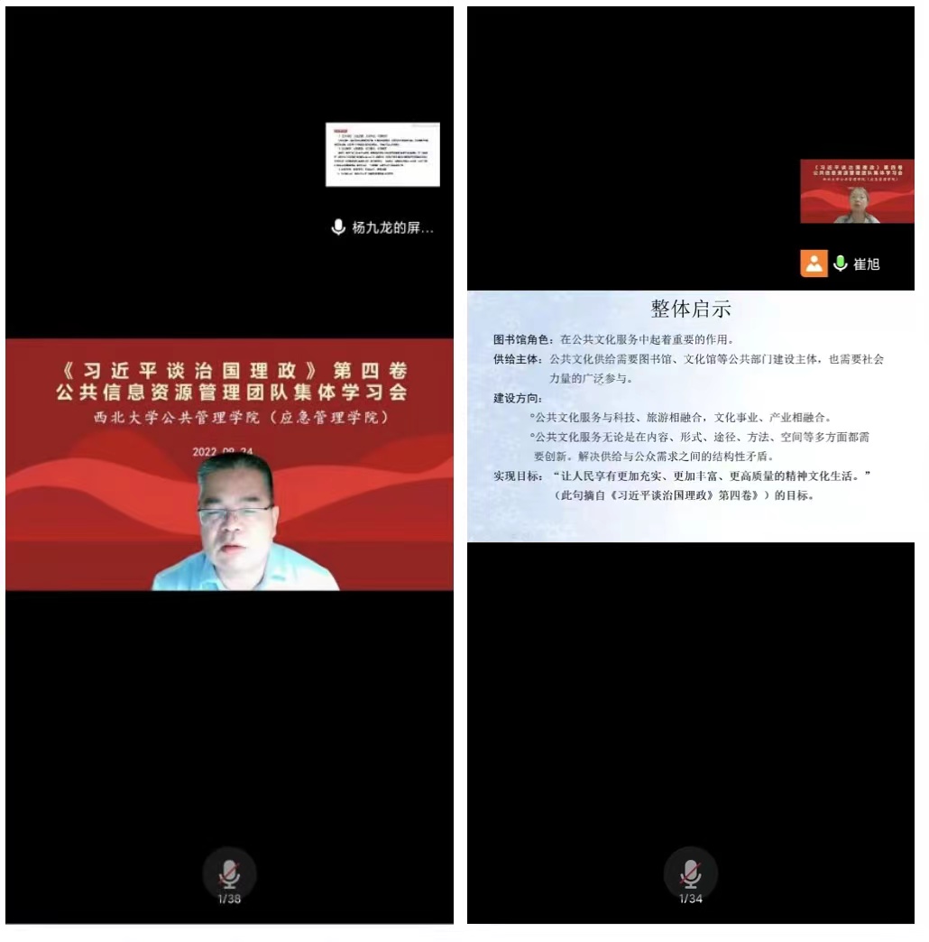 习近平总书记指出:“要坚定文化自信,推动中华传统文化创造性转化、创新性发展、继承革命文化,发展社会主义先进文化,不断铸就中华文化新辉煌,建设社会主义文化强国。”为进一步提升社会主义文化强国建设,提升团队在公共文化研究领域的专业度,提高师生对公共文化政治站位的认识。2022年9月24日晚上19时,借助腾讯会议平台,公共信息资源管理团队集体学习了《习近平谈治国理政》第四卷。本次学习会围绕习近平总书记的讲话精神,结合图书情报与档案管理研究领域,公共管理学院杨九龙教授、崔旭教授、李姗姗副教授、张新鹤副教授做了发言,本次集体学习会由公共管理学院王铮副教授主持。