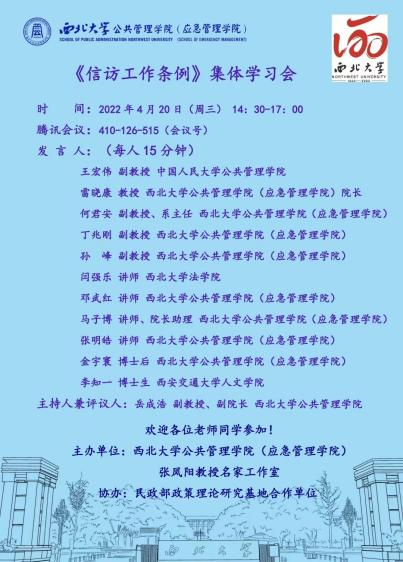 2022年4月20日下午,由西北大学公共管理学院(应急管理学院)主办,张凤阳教授名家工作室和西北大学民政部政策理论研究基地合作单位协办的《信访工作条例》集体学习会以腾讯会议方式顺利举办。会议由我院副院长岳成浩副教授主持,十位老师作了主题发言,三十多位师生参加了本次学习会。各位老师从政治学、法学、管理学等多学科、多角度对最新的《信访工作条例》进行了详细分析和深入解读,让我们对于我国《信访工作条例》的未来发展充满了期待。