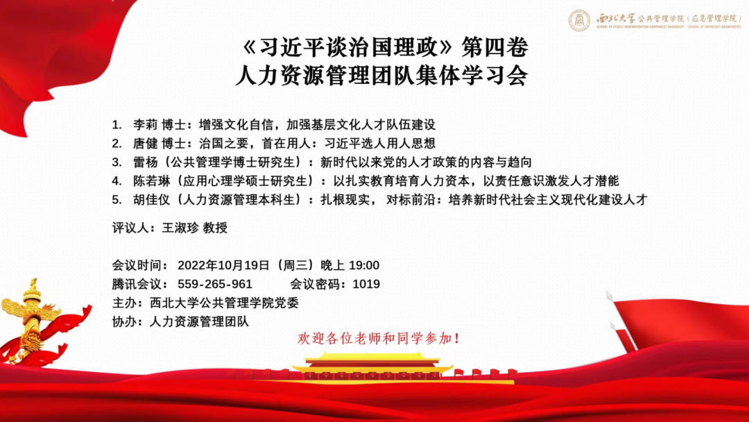 2022年9月底10月初,我院公共行政学系、社会保障学系、信息资源管理学系、人力资源管理系、公共政策与管理系等各个系与学科团队分别举行了《习近平谈治国理政》第四卷集体学习研讨会,与会师生从各自学科角度畅谈了学习收获,加深了对《习近平谈治国理政》第四卷内容和精神的理解。
