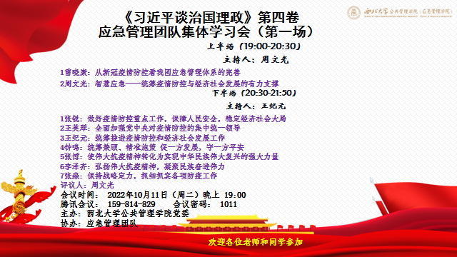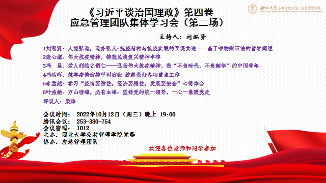 2022年9月24日,西北大学公共管理学院(应急管理学院)于线上开展“中国这十年”应急管理学术研讨会,应急管理团队的教师和博、硕士研究生先后围绕应急管理的不同方面进行了研讨与交流。来自各大院校的师生参加了会议,全天累计观看达288人次。参与本次研讨会的13位应急管理团队的老师、博、硕士研究生的发言聚焦主题,内容丰富,启发与会嘉宾对我国应急管理事业的十年成就、发展现状与未来进路进行更深层次的思考。