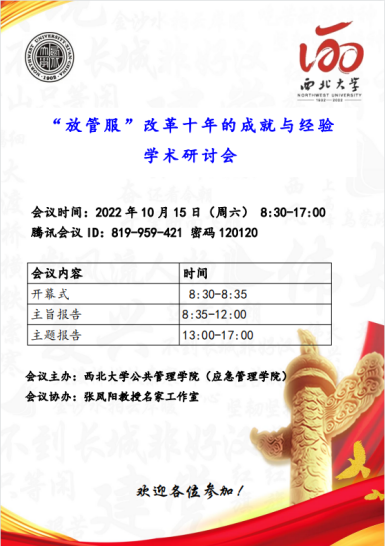 2022年10月15日,由西北大学公共管理学院(应急管理学院)主办、张凤阳教授名家工作室协办的“‘放管服’改革十年的成就与经验学术研讨会”在线顺利召开,来自中国行政管理学会、南京大学、中国人民大学、四川大学、山东大学等单位的200多位代表和师生参加了本次研讨会。