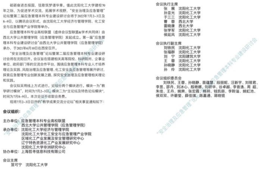 由全国应急管理本科专业高校联盟(虚体会议型联盟&学术共同体)、西北大学应急管理学院主办,沈阳化工大学承办的“安全治理及应急管理”论坛暨第二届应急管理本科专业建设研讨会于2022年7月2-3日及8-9日期间在线举办。来自全国高校和科研院所的400余位专家学者和师生参会,共同探讨应急管理本科专业建设与发展路径,助力实现应急管理本科专业高质量发展目标。我院师生积极参加研讨会并在相关分论坛作主题发言。