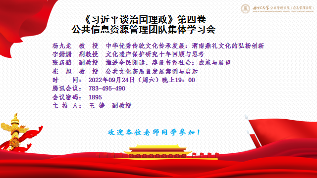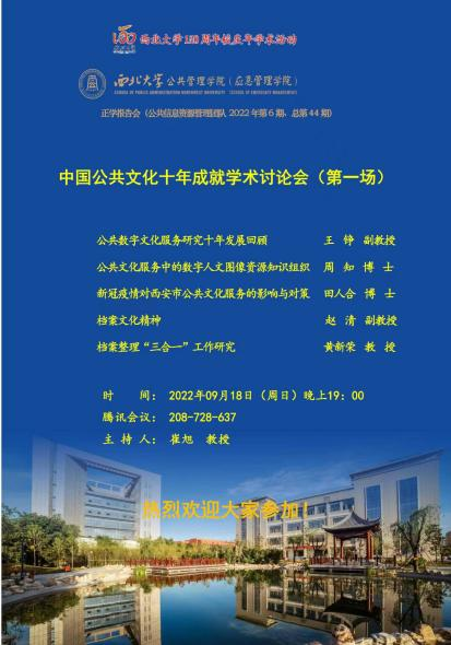 2022年9月18日晚7时,西北大学公共管理学院(应急管理学院)于线上开展“中国这十年”中国公共文化十年成就学术讨论会,各位教师和博士研究生先后进行了《公共数字文化服务研究十年发展回顾》、《公共文化服务服务中的数字人文图像资源知识组织》、《新冠疫情对西安市公共文化服务的影响与对策》、《档案文化精神》、《档案整理“三合一”工作研究》的主题报告分享,内容丰富,能够启发与会嘉宾对我国公共文化事业的十年成就、发展现状与未来进路进行更深层次的思考。