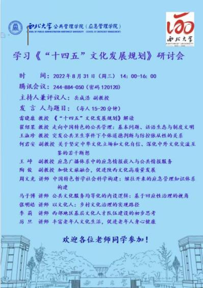 2022年8月31日,由公共管理学院主办的学习《“十四五”文化发展规划》研讨会于腾讯会议线上正式举行,一百多位师生在线参加此次研讨会。我院11位教师代表不同团队分别做主题发言,大家从多个学科角度提出了对文件新见解与新思考。我院积极响应国家号召,适时组织集体学习与研讨,深化了对国家政策的理解,也促进了多学科的交流与融合。