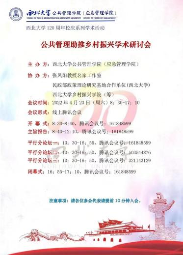 西北大学公共管理学院(应急管理学院)主办、张凤阳教授名家工作室、民政部政策理论研究基地合作单位(西北大学)、西北大学乡村振兴学院(筹)承办的“公共管理助推乡村振兴”学术研讨会于2022年4月23日以腾讯会议的形式顺利召开。来自南京大学、浙江大学、中国社会科学院大学等约20所高校单位和科研单位的将近180名学者参加了本次会议。本次研讨旨在响应国家战略号召,推进乡村振兴发展,同时为西北大学120周年校庆献礼。