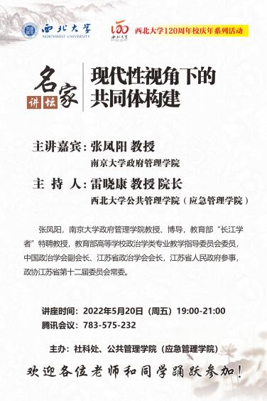 2022年5月20日,由西北大学社科处、公共管理学院联合主办的名家讲坛在线成功举办。教育部特聘教授、南京大学政府管理学院张凤阳教授受邀作了题为“现代性视角下的共同体构建”的学术报告。公共管理学院(应急管理学院)院长雷晓康教授主持讲座,来自北京大学、厦门大学、西安交通大学、吉林大学、西北大学等多所高校的160多名师生参与了此次讲座。这场讲座,对于我们理解人类命运共同体、学术共同体、宗族共同体、行业共同体等各种共同体具有极大的启发意义。