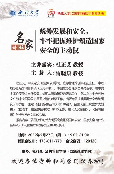 2022年9月27日,由西北大学社科处、公共管理学院(应急管理学院)联合主办的名家讲坛在线成功举办。中央党校(国家行政学院)应急管理培训中心副主任、中欧应急管理学院副院长杜正艾教授受邀作了题为“统筹发展和安全,牢牢把握维护塑造国家安全的主动权”的学术报告。来自中国人民大学、暨南大学、济南大学、西北大学、石河子大学、内蒙古大学、沈阳化工大学、宝鸡文理学院等多所高校的160多名师生参与了此次讲座。杜教授的报告紧古今兼顾,中外结合,基础与前沿贯通,生动入心,富含启迪,是一个高水平的学术报告。这场讲座,对于我们深刻理解“国家安全”学术前沿理论具有极大的启发意义。