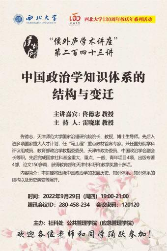 2022年9月29日19点,由西北大学社科处、公共管理学院(应急管理学院)联合主办的“侯外庐学术讲座”第243讲成功举办。天津师范大学党委常委、副校长佟德志教授受邀作了题为“中国政治学知识体系的结构与变迁”的学术报告。来自北京大学、天津师范大学、南京大学等40多所高校300余名师生参与了此次讲座。