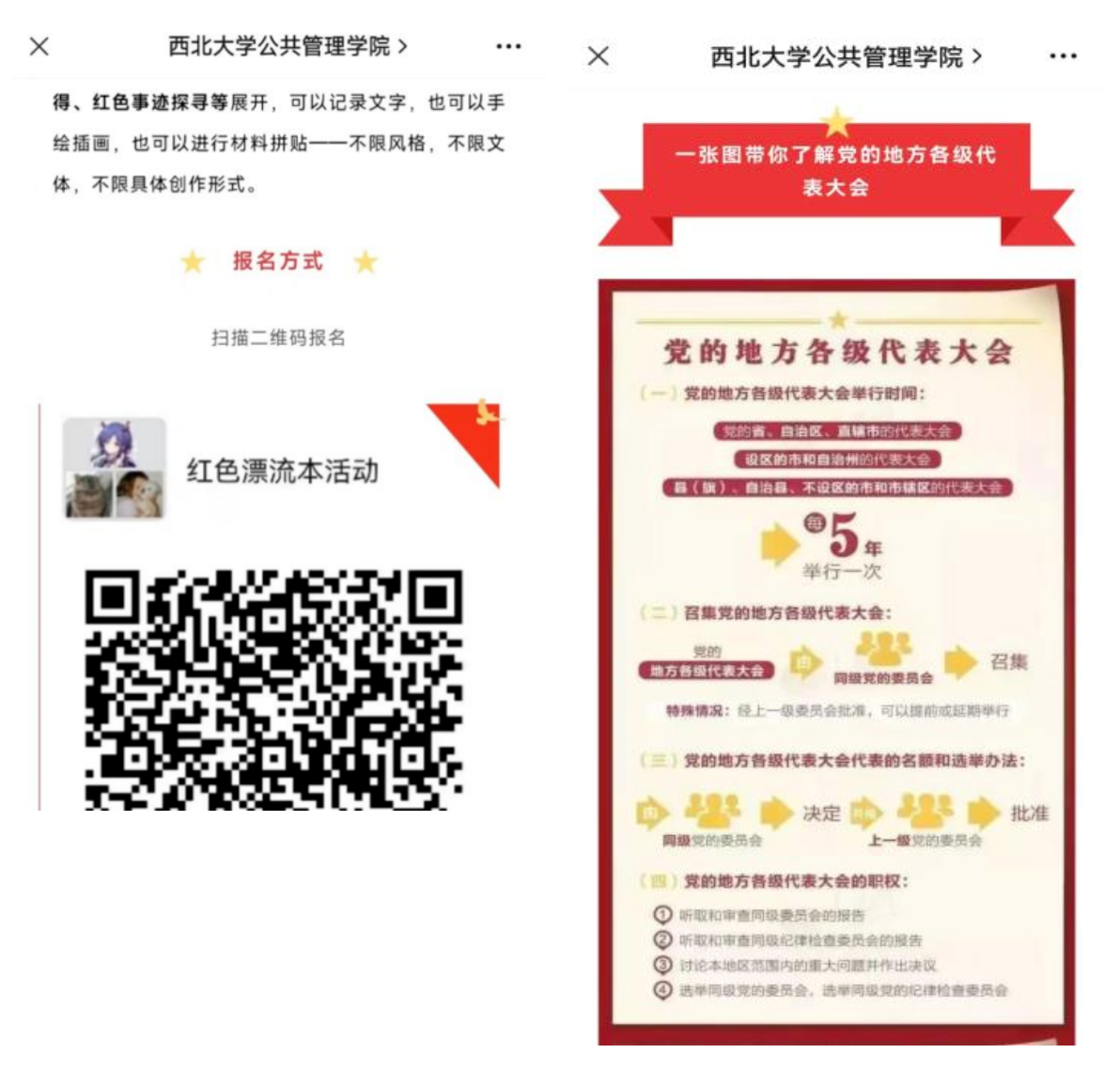 在党的二十大召开和西北大学建校120周年校庆到来之际,公共管理学院举办了“喜迎党的二十大”系列活动,包括红色手账漂流活动、“迎校庆”书画作品征集展示活动、十四天校史阅读打卡、党代会和校史知识专栏等,有力宣传了中国共产党的红色力量以及百廿西大的辉煌成就,使同学们在熏陶中感受伟大的新时代。