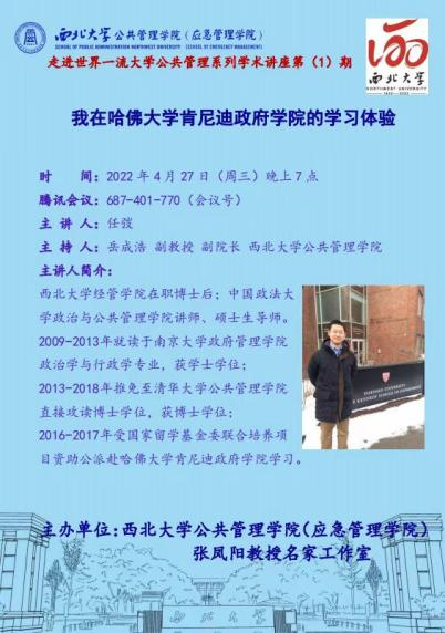 由西北大学公共管理学院(应急管理学院)和张凤阳教授名家工作室联合主办的“走进世界一流大学公共管理系列学术讲座”第(1)期于2022年4月27日在我院成功举办。本次讲座的主题为:“我在哈佛大学肯尼迪政府学院的学习体验”,任弢老师是西北大学经管学院在职博士后、中国政法大学政治与公共管理学院讲师、硕士生导师。任弢老师的分享使同学们对这一世界顶尖大学的基本情况和学习模式有了进一步了解,同学们表示要发挥本专业的优势为国家或者地方做出我们的贡献。