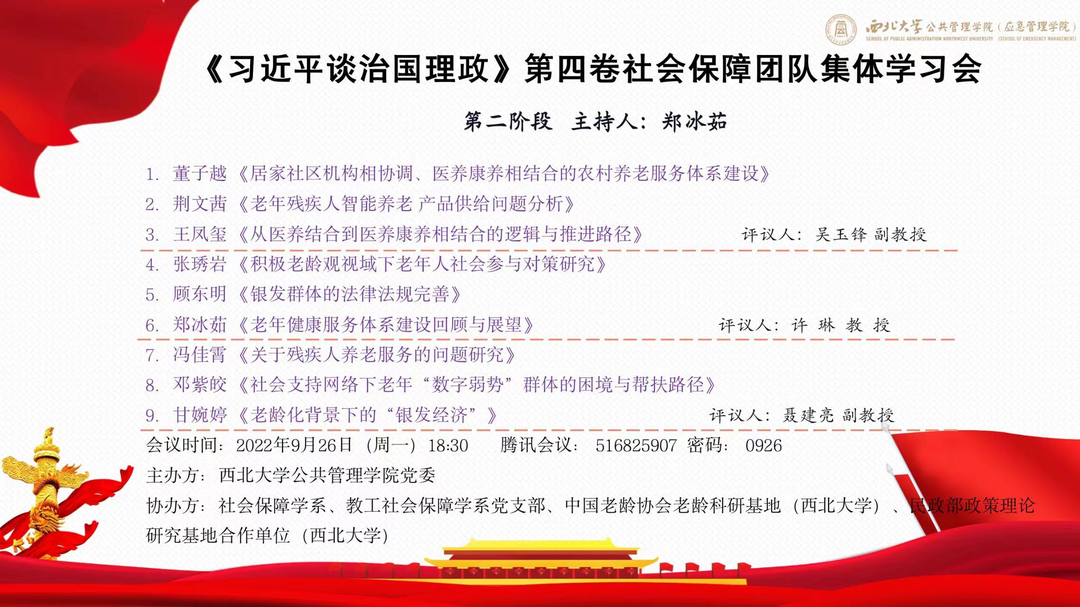 党的十八大以来,我国高度重视社会保障事业发展,将社会保障作为治国安邦的大计。2012年至今是我国社会保障事业发展至关重要的十年,充满了机遇与挑战。2022年9月8日晚,西北大学公共管理学院(应急管理学院)社会保障系举办了“中国这十年:社会保障十年发展学术研讨会”,来自西北大学、厦门大学、中国人民大学、复旦大学、吉林大学、等高校的110余名教师和硕博士生在线参加了研讨会,就社会保障十年发展历程展开集中学习研讨。此次学习研讨会对我国社会保障发展做出了全面立体的分析,有利于今后的研究与学习。