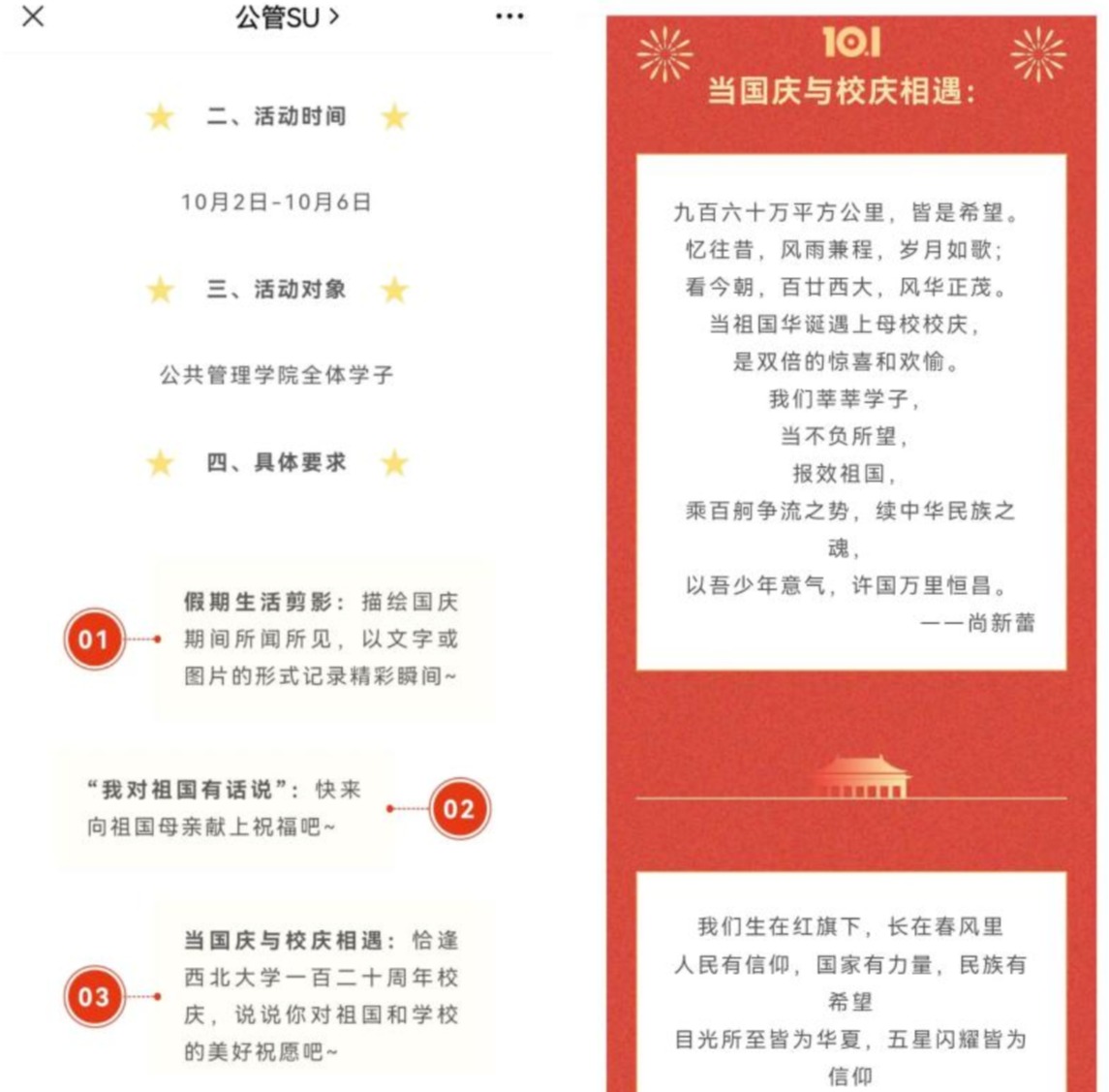 值此国庆到来之际,我院学生会为展示同学们的国庆假期并增强大家的家国情怀,于10月2日至10月6日面向公共管理学院全体学子征集假期生活剪影和对祖国、对学校的美好祝福。