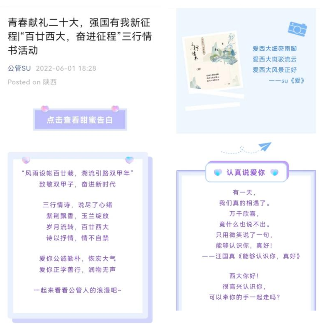为迎接西北大学双甲子校庆,丰富校园文化,我院学生会于2022年5月24日至28日面向全院学生开展三行情书活动,以“对大学生活的感悟,歌颂西大百廿历史征程”等为主题,表达公管学子对西北大学的祝福。