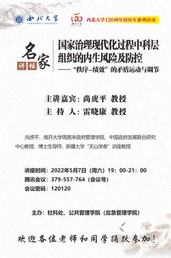 2022年5月7日,由西北大学社科处、公共管理学院(应急管理学院)联合主办的名家讲坛在我院成功举办。南开大学周恩来政府管理学院、中国政府发展联合研究中心教授、博士生导师,新疆大学“天山学者”讲座教授尚虎平教授,作了题为“国家治理现代化过程中科层组织的内生风险及防控——“秩序-绩效”的矛盾运动与调节”的学术报告,来自全国多所高校的160多名师生在线听取了报告。