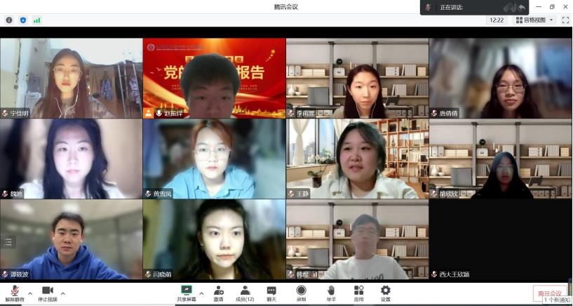 在支部开展主题党日活动之余,各党小组充分发挥集体学习优势,营造集体学习氛围,由党小组组长带领、支部委员协助,线上开展组内党的二十大精神学习研讨会。通过学科视野下对报告内容的深入探讨,各位党员同志深刻领悟了党的二十大报告的时代意涵,再度明晰了当代青年的历史使命与责任担当。