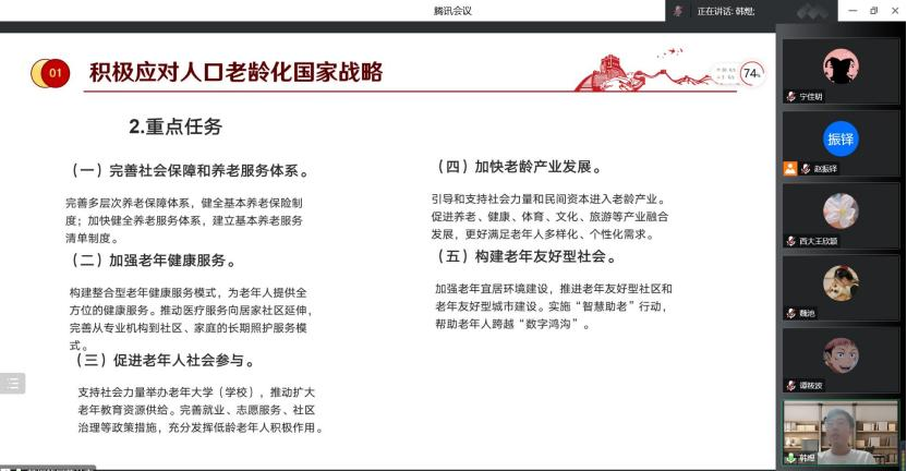 习近平总书记在党的二十大报告中再次强调要坚持积极应对人口老龄化国家战略。人口老龄化是社会发展的重要趋势,我国人口老龄化程度进一步加深,未来一段时期将持续面临人口长期均衡发展的压力。实施积极应对人口老龄化国家战略,事关国家发展全局,事关百姓福祉,是践行党的初心使命、坚持以人民为中心发展思想的重要体现,对我国经济社会持续健康发展具有重大和深远的意义。“莫道桑榆晚,为霞尚满天。”进入新时代,老龄工作被赋予了新的使命。我们作为行政管理专业的研究生,要做国家战略的宣传者、研究者和推动者,积极开展理论研究、实践研究与政策研究,变问题为经验,化挑战为机遇,为实现健康老龄化社会建言献策。