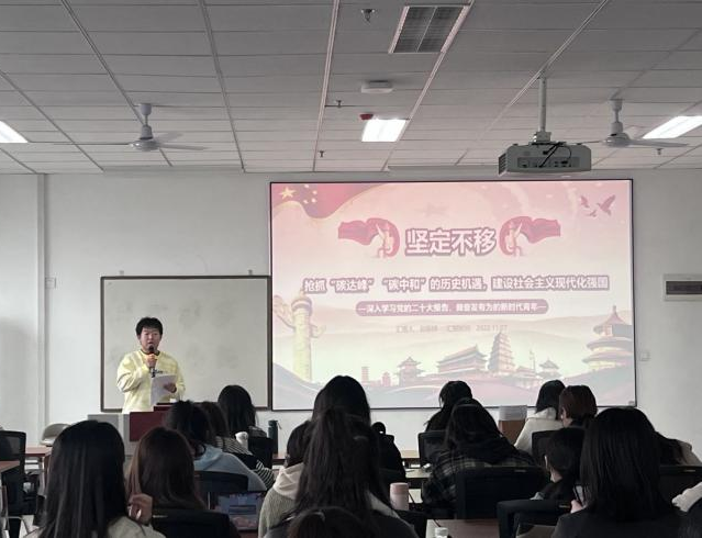 赵振铎同志从“实现碳达峰、碳中和”角度分享自己的学习感悟。他以党的二十大报告中碳达峰碳中和相关内容引入,解读双碳目标在统筹国内国际两个大局、着力解决资源环境约束突出问题、实现中华民族永续发展、构建人类命运共同体等方面的作用。赵振铎同志立足学科专业研究,期望支部各位同志在研究中抢抓“碳达峰”“碳排放”的时代风口,在政府管理研究中将碳达峰贯穿于经济社会发展全过程和各方面,重点关注能源绿色低碳转型、节能降碳增效等领域,形成紧贴我国实际、切实有用的科研成果。