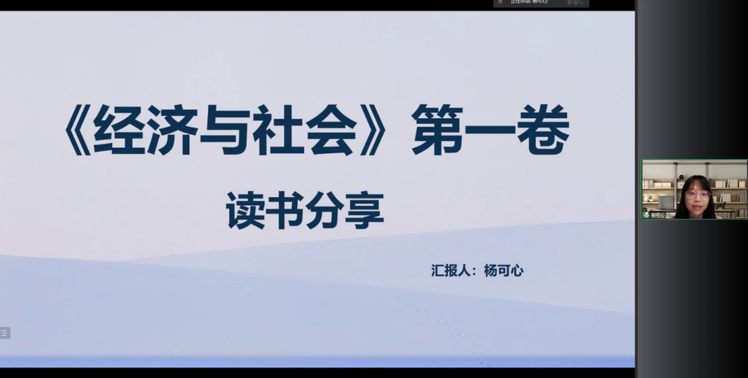黄润芸博士对汇报内容做出点评,她指出杨可心同学构建的理论架构较为完善,可以很清楚地了解她对该书理论的思考与理解。与此同时,她指出在之后的阅读中可以思考《经济与社会》这本书对我们来说有哪些值得借鉴反思的地方或者后人再写类似文章或研究这本书中可以从哪些地方提出改进。